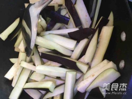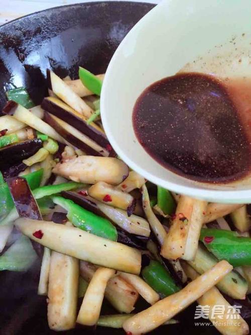 8倒入勾芡汁。中火翻炒至茄条松软,出油,完全融合汁液,大约十分钟。