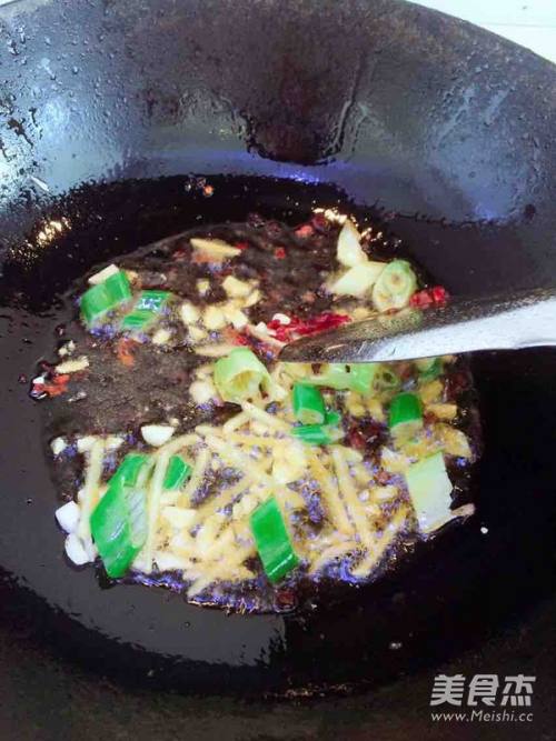 5倒入适量食用油,加入豆瓣酱以及碎辣椒,炒香。