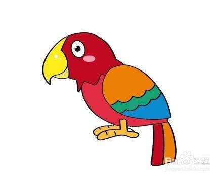 然后把鹦鹉的嘴巴涂成黄色,头部涂成枣红色,翅膀涂成橙色和蓝色,尾巴涂成橙色和枣红色。