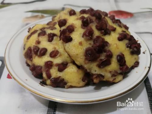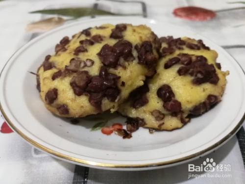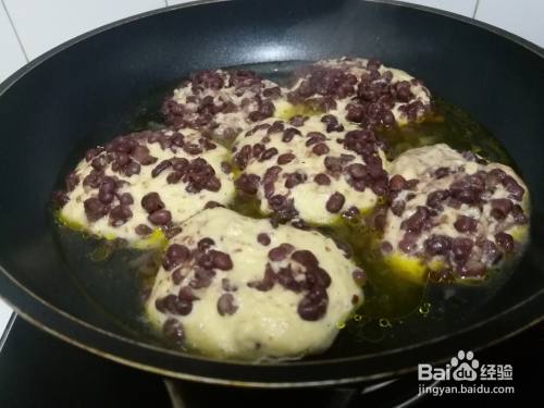 红小豆放入面糊中拌一下,取适量面糊做成饼胚放入锅中,倒入100克左右的水,盖上盖中火煎制。