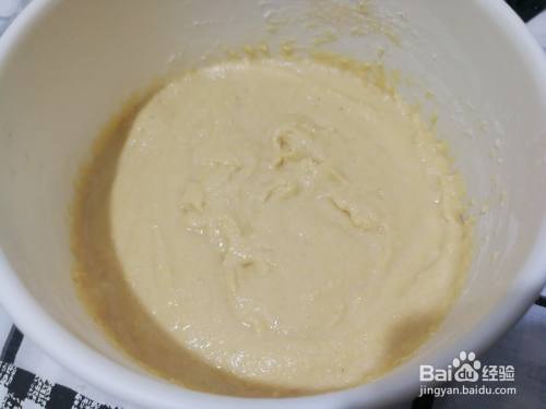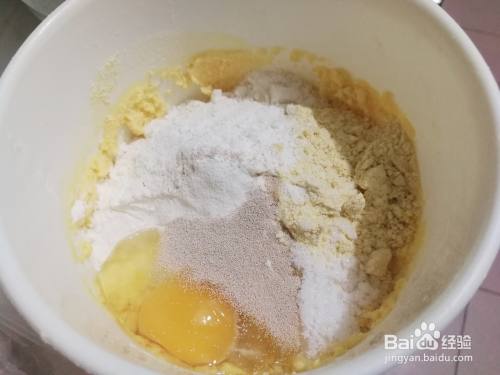玉米面,黄豆面,面粉放入盆中,磕入1个鸡蛋,放入酵母,白糖,加温水搅拌成面糊,盖上盖发酵。