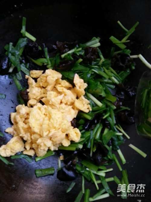 2黑木耳用开水焯一下用手撕成小块,鸡蛋打散,韭菜切段(韭菜的茎和叶分开放)
