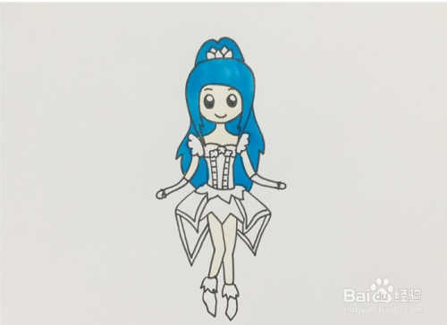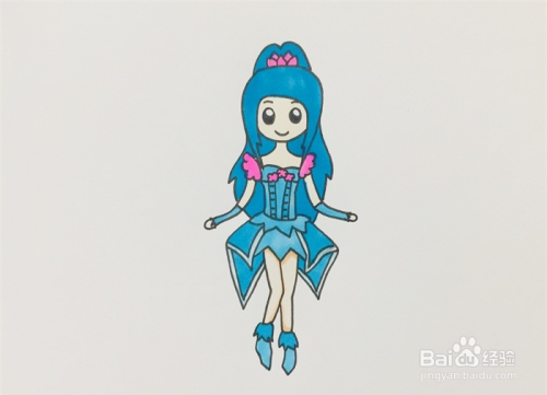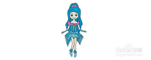 最后将她的头饰与衣服用粉色和蓝色组合涂上