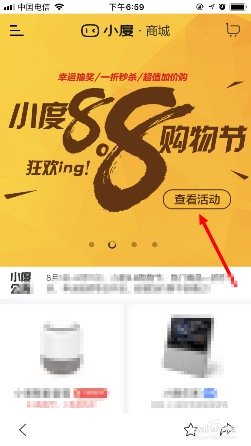 进入 小度商城 后,可以在首页面上端的滚动广告条中看到 小度8.8购物节 的活动图标,点击 查看活动 。