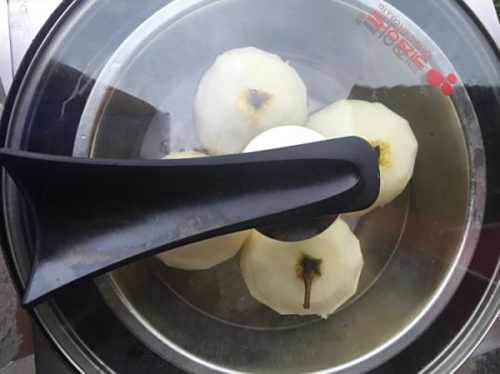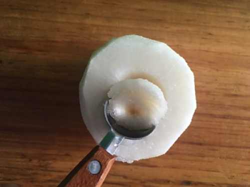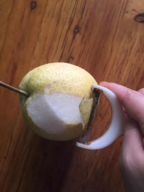 雪梨先削去外皮,在1/3处切开,当做盖子