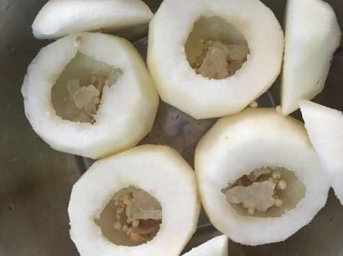 平整的摆在碗里,在雪梨内加入百合、川贝、冰糖