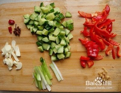 准备好黄瓜,红柿子椒,葱蒜姜,干红椒,八角