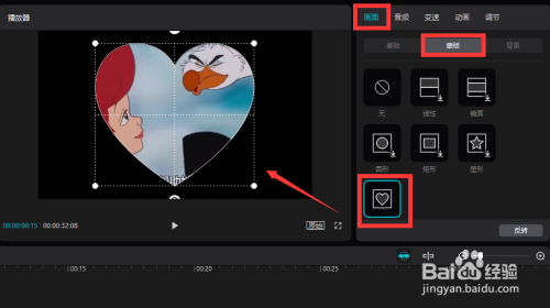 如果想对视频添加蒙版,可以在选中视频的情况下,切换到“画面”-“蒙版”选项卡,从中选择一种蒙版样式进行应用即可。
