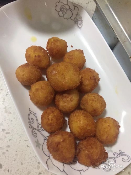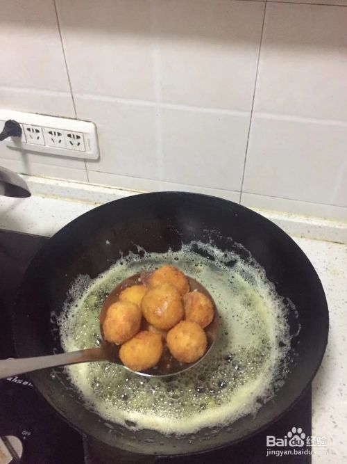 将和好的丸子团,一个个放入到下面撒上淀粉的盘子里,并把每个和好的丸子蘸上鸡蛋液,后准备好油锅烧热后,开始慢慢地放入蘸过鸡蛋液的丸子,开始煎炸,如图所示。