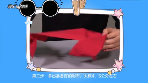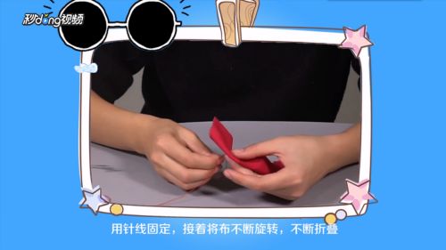 5对折后,将红布呈三角形折叠,用针线固定,不断旋转折叠。