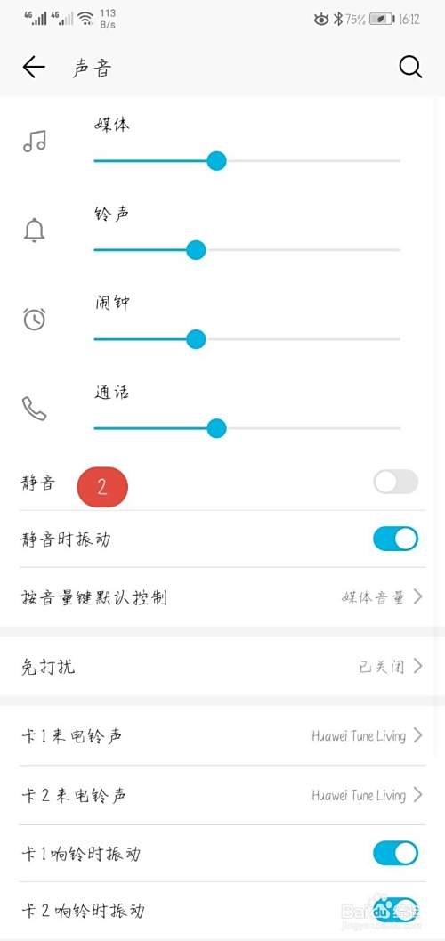 也可以将静音开关打开,将卡1卡2来电铃声调成无,这些都可以很好的将华为手机铃声关闭。不过最简单的还是直接静音。