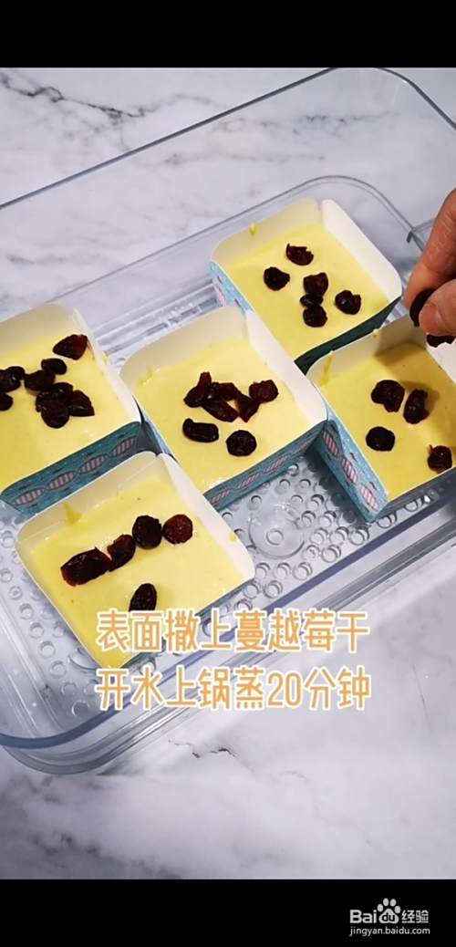 在表面撒上蔓越莓干。开水上锅蒸20分钟,焖五分钟开盖。