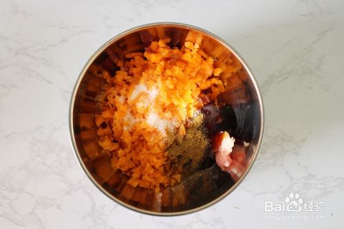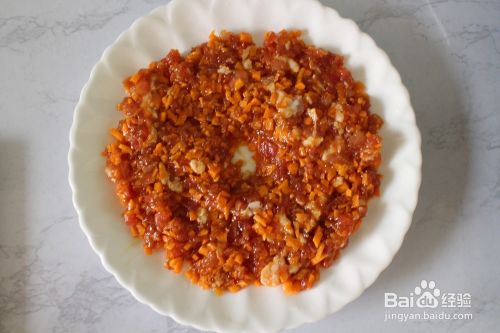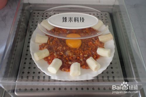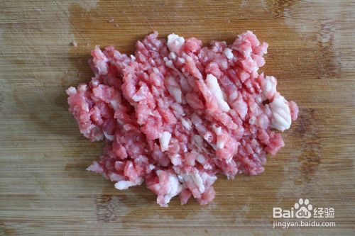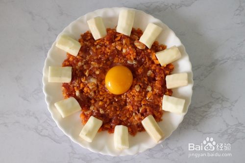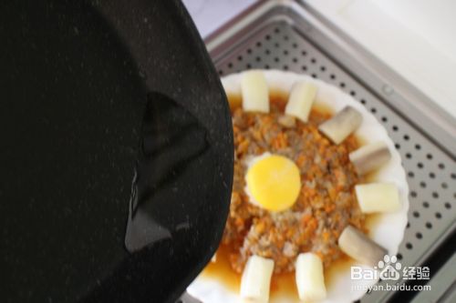 然后中间放一个蛋黄,第二步将蛋清放入肉馅中。