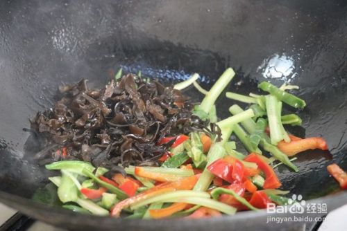 1汤匙油翻炒切好的所有蔬菜,炒至半熟时起锅,备用。