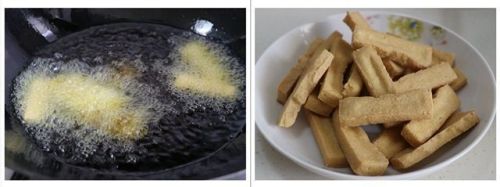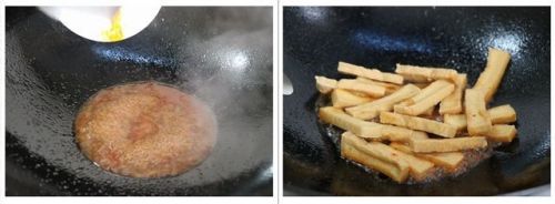 少许油 加入适量清水,辣酱(咸辣味,无蒜)、白糖放入锅里搅拌匀。加入豆腐收汁,至半收汁时,汤汁和豆腐一起 铲起备用。