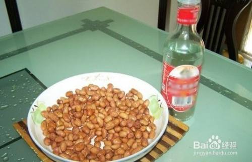 2、炸好后的花生米趁热洒上少许白酒,然后搅拌至白酒与花生米混合均匀。