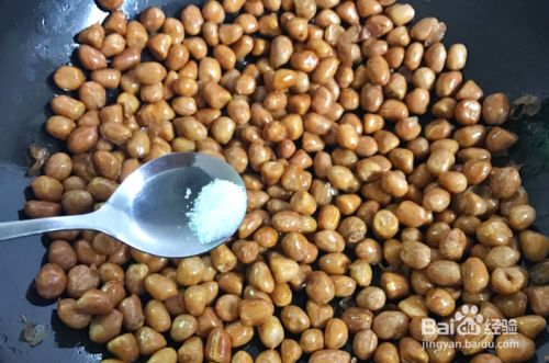 3、待拌了白酒的花生米稍稍放凉后,再均匀地撒上少许食盐在花生米上。