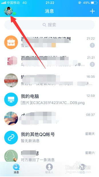 首先,打开并登录qq,进入qq的主页聊天列表,点击左上角的头像,如图所示。