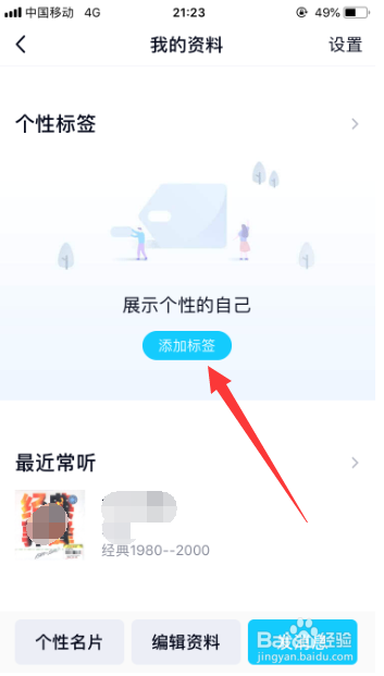 然后可以进入qq的个人资料设置页,滑动页面,就可以看到“个性标签”的模块,点击其中的“添加标签”,如图所示。