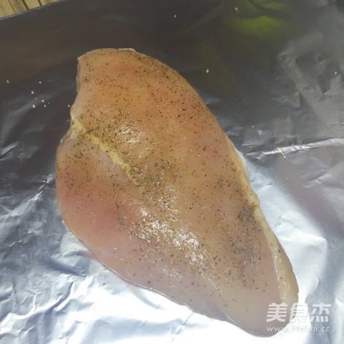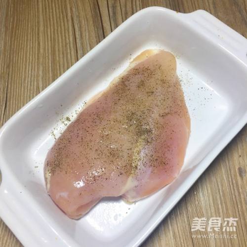 1鸡胸肉洗净沥干水分,两面均匀的抹上食盐和黑胡椒粉,腌制15分钟