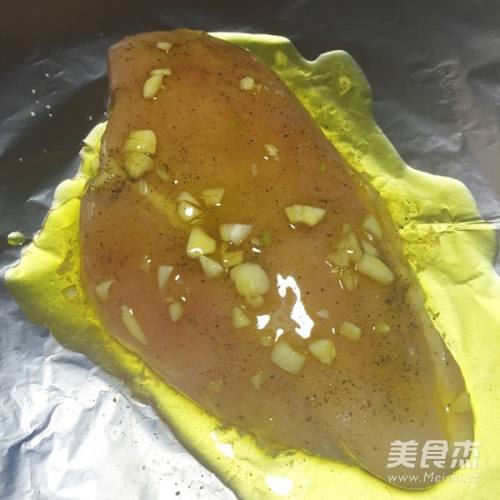 4均匀的抹上调味汁,调味汁要充分的覆盖住整块鸡胸肉