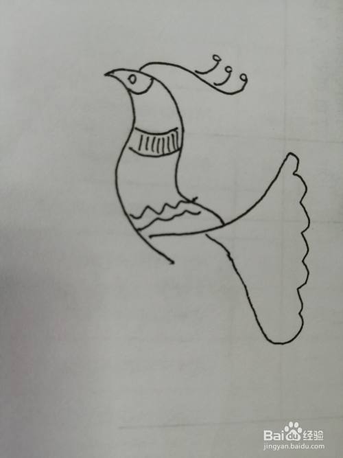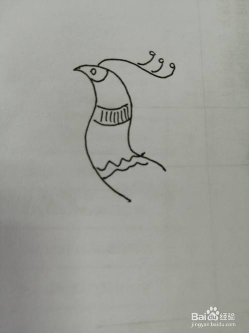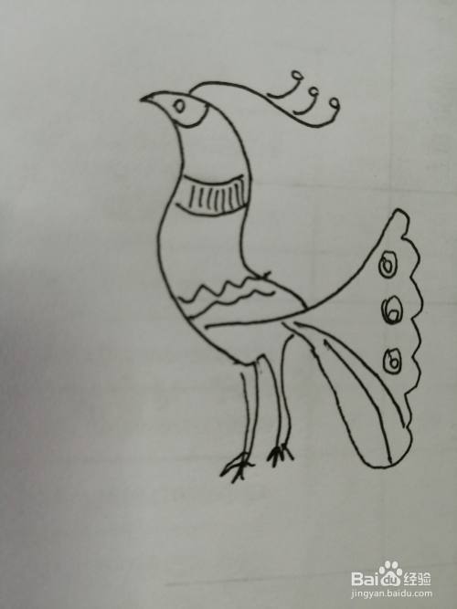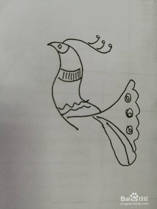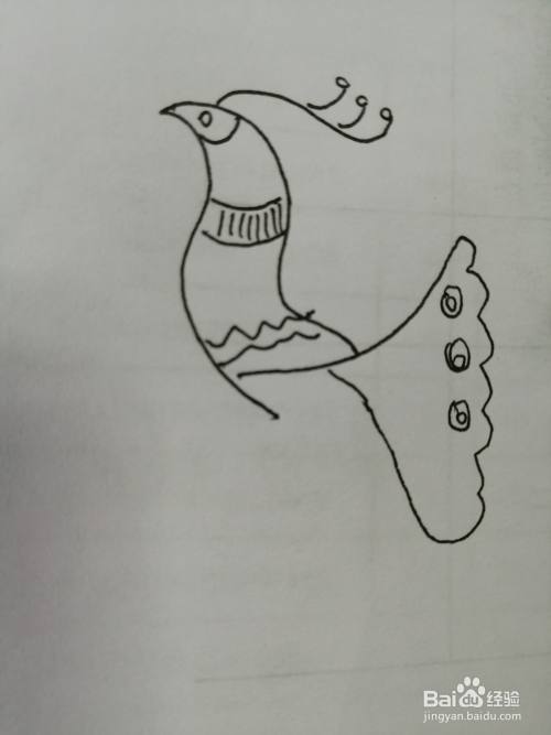 第五步,继续画出简笔画漂亮的的小孔雀的小尾巴部分。