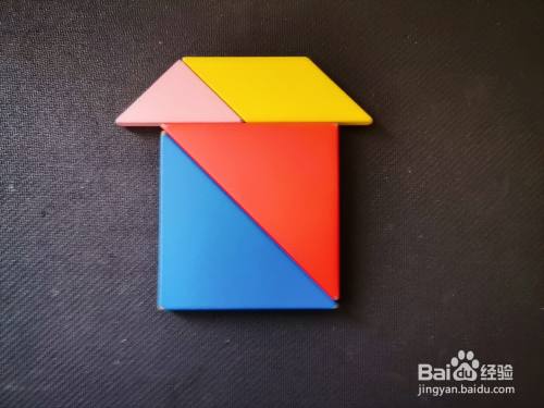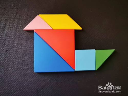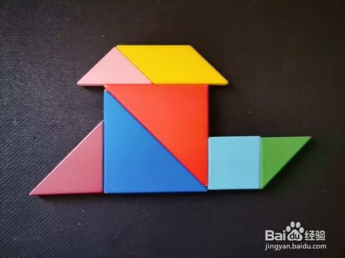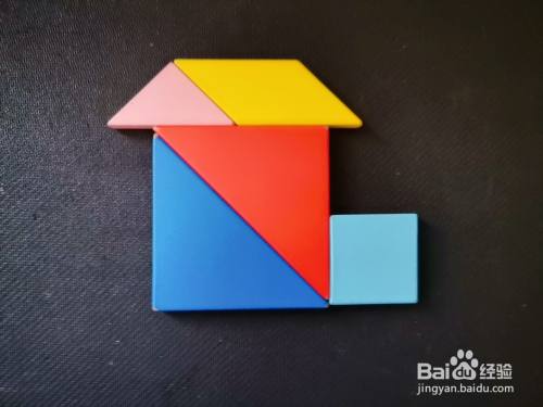 拿出一个天蓝色正方形放在红色大三角形的右边,如下图所示。