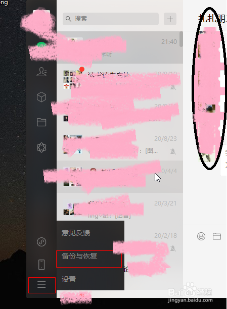 登录电脑上的微信,左下角的功能栏点开后,找到备份与恢复。