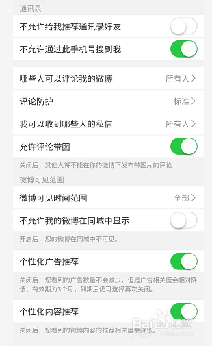点击这些绿色按钮,即可不让身边熟悉自己知道自己的手机号码的人搜到自己的新浪微博账号了。也不让系统自动把自己账号推荐给通讯录好友。