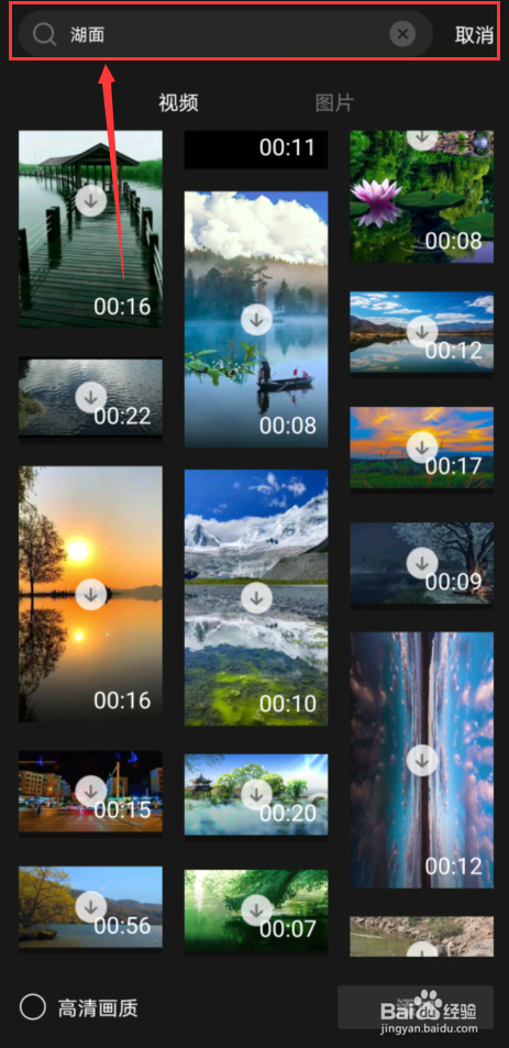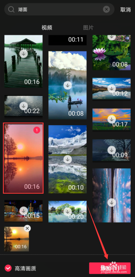 在素材库里搜索“湖面”,添加需要的湖面素材图片或视频。