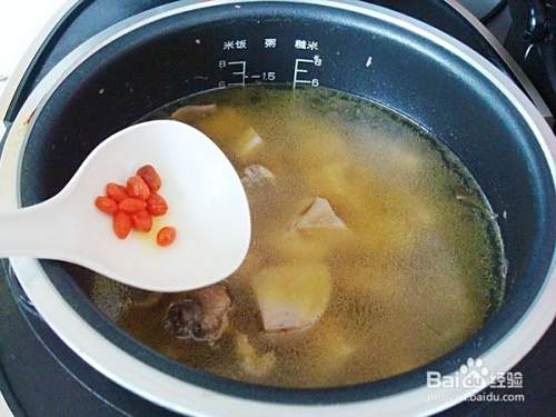等时间到,煲汤功能结束,煮至跳到保温档,加枸杞搅拌均匀