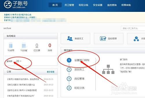 首页会显示已经设置了多少个“子账号”和剩余“子账号”,基础版最多只能设置20个“子站号”,找到“设置部门结构”,点击进入