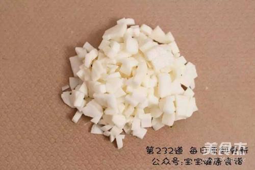 3煮粥的时候开始准备其它食材,山药去皮(记得戴手套哦,防止对山药粘液过敏),切成小丁备用。