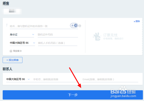 这时,我们需要输入乘客的信息,比如姓名、手机号、身份证号,然后点击“下一步”。