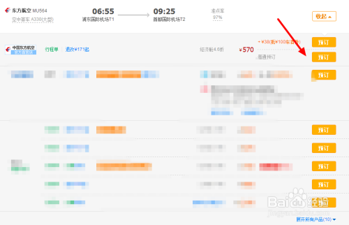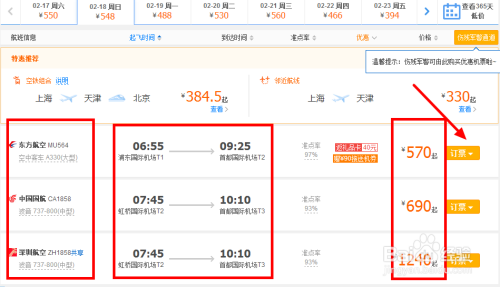 在接下的页面会显示出发当天所有航空公司的飞机信息。如飞机类型、起飞及降落时间、票价等等(小编只是截取了其中一小部分)。选择好后,点“订票”。