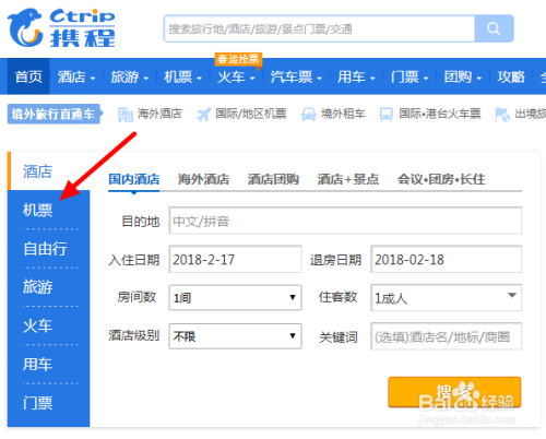 登录后,在网页左上端,点击下图红色箭头所指的“机票”。