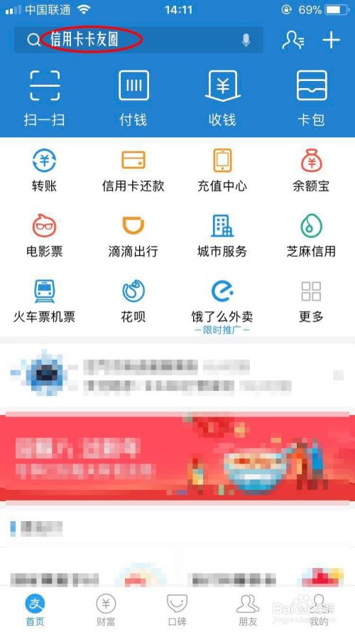 现在信用卡的用户越来越多了,但很多人还不懂得使用信用卡,这不在支付宝内就是有下信用卡的交流圈,里面有上万的卡友在里面交流心得。现在就教大家如何进入这个信用卡卡友圈。