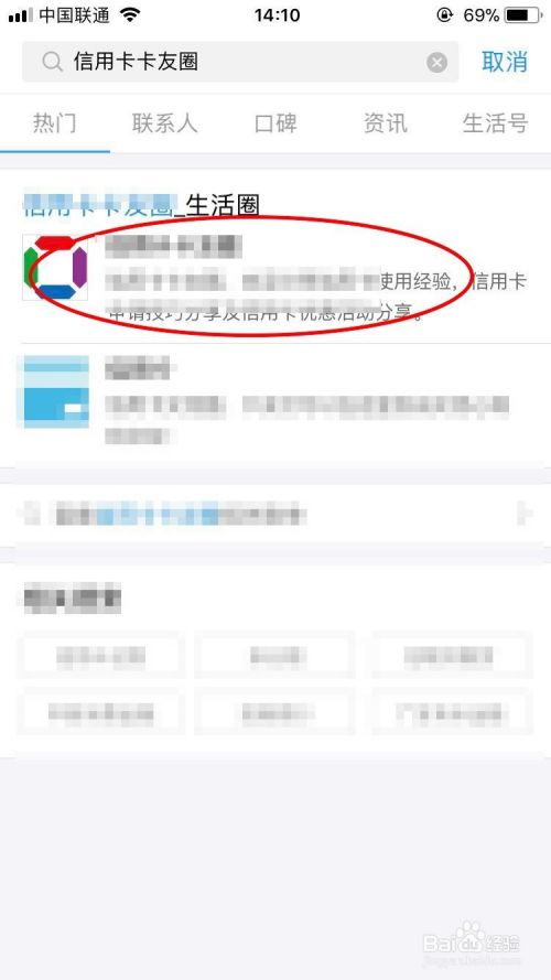 进入搜索结果页面后,点击第一条结果进入“信用卡卡友圈”主页;