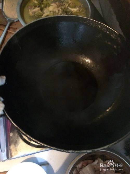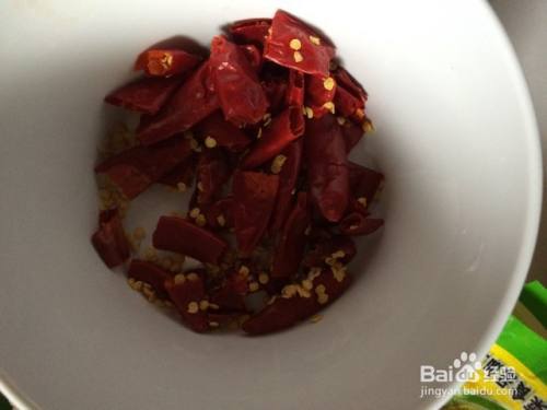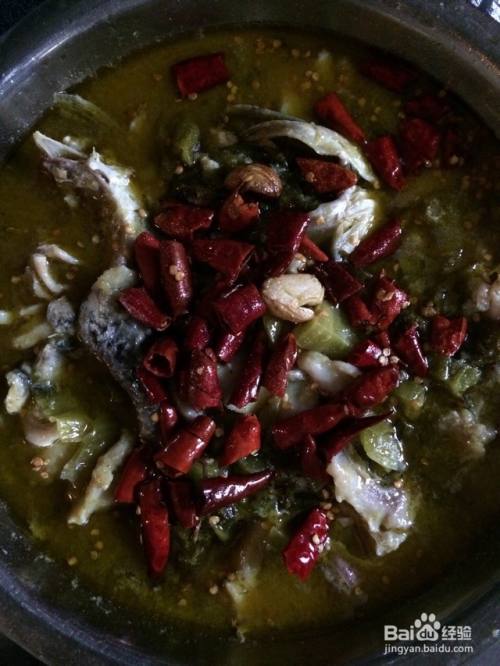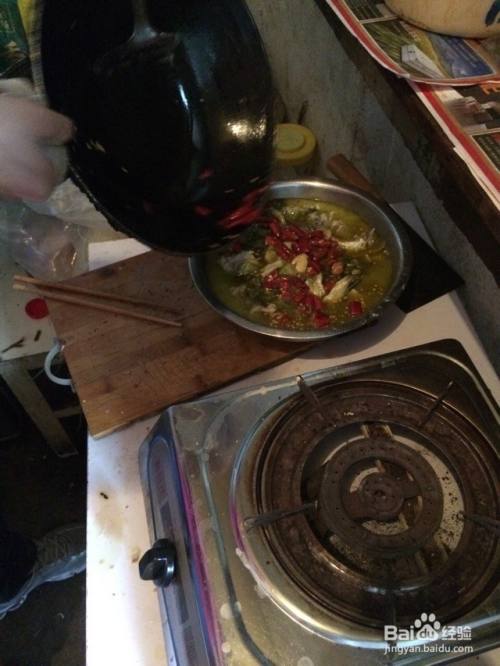 当油温烧到一定温度的时候关火炒辣椒,辣椒稍微过油后浇到鱼上