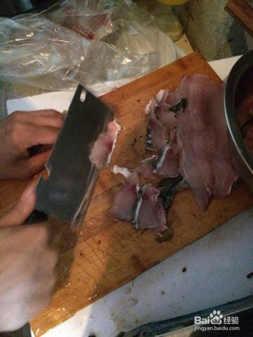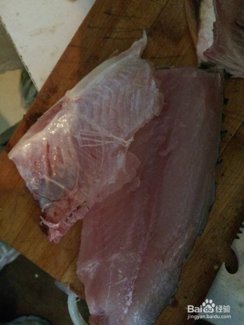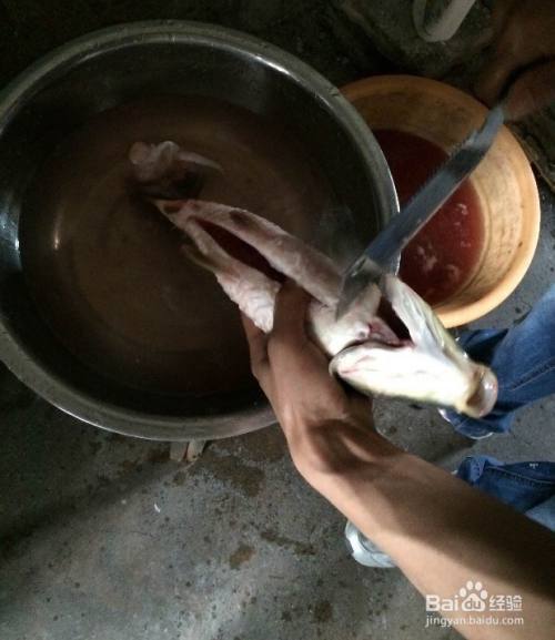 把鲤鱼切成两半后,侧切将鱼骨和肉分别切开,并且取出鲤鱼腥线
