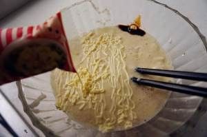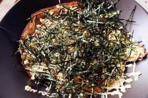 山药饼出锅在上面浇上细密的井字色拉铺上海苔丝