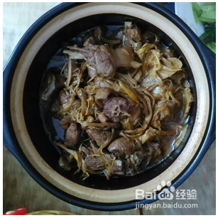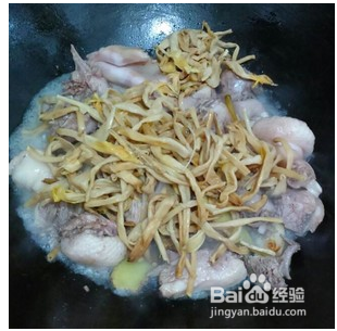 鸭肉多煮一会,加入黄花菜翻炒。