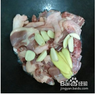 空锅开大火,放入鸭肉,再放入姜蒜一起炒。