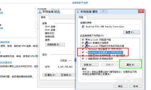 单击“属性”,弹出“本地连接属性”,选择“Internet协议版本4(TCP/IPv4)”,单击绿色框中的“属性”。