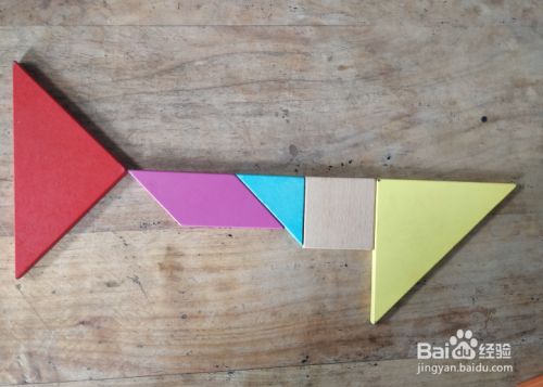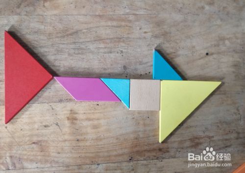 摆上中号三角形,放在右侧大三角形的右侧挨着,直角向上,如图。一条大鲨鱼就拼组好了。