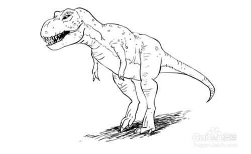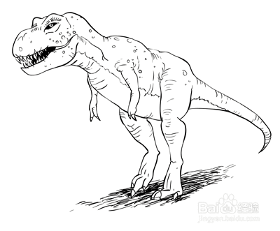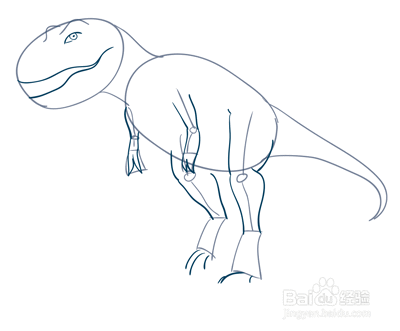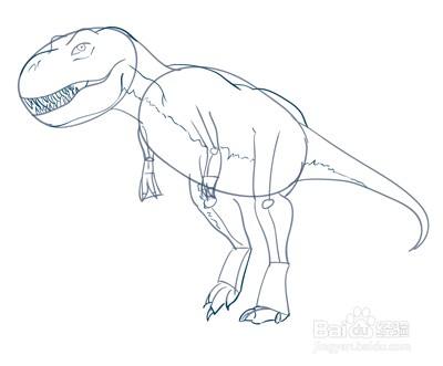 现在我们可以用棒图来增强T-Rex的形式。在这一步中还会添加一些细节。这些细节包括嘴和眼睛的几行。在第一步中绘制的椭圆形可以用作放置特征放置位置的指南。我们也可以画出几条爪子的开始。