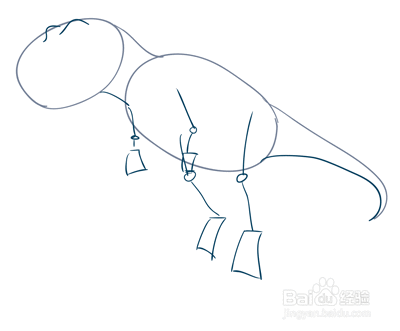 在绘图的开始阶段稍微松散很重要。我们首先需要确定恐龙要填满飞机的空间。一些椭圆形将在这里进行 - 一个用于头部,另一个用于身体。从头部的形状通过身体并且尾部的末端也画出一条线。