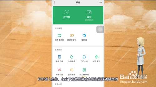打开进入微信,在右下方找到我点击服务选择钱包选项。
