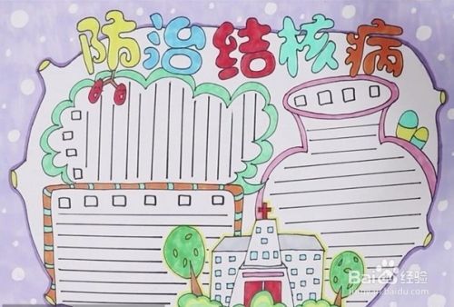 首先画一个大的边框,写出主题,底部画上医院,画出三个边框,先给手抄报边缘涂紫色,主题涂彩色,边框涂上薄荷绿、黄色和粉色,医院涂上灰色,树木涂绿色,最后在边框中画上横线,简单好看的防治结核病手抄报就完成啦!