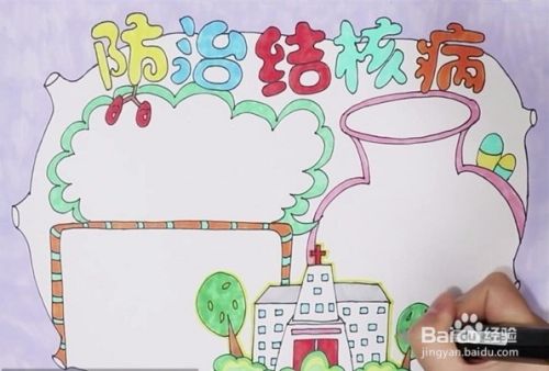首先画一个大的边框,在边框的上方写出主题“防治肺结核病”,并在手抄报底部画上医院,医院周围画上树木。
